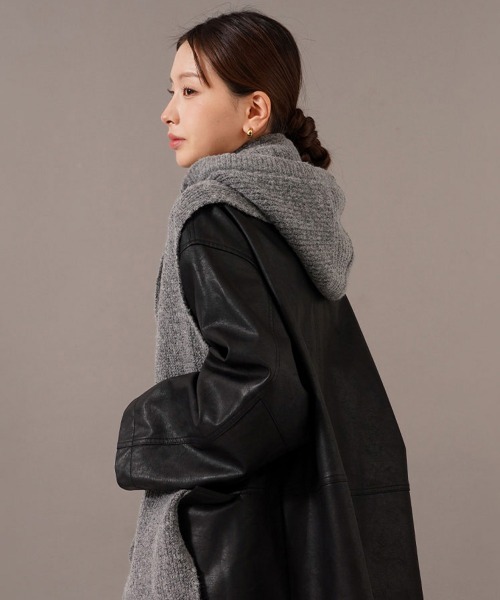 マフラーとフードがドッキングしたデザインのニットマフラー。