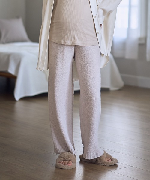 ふんわり柔らかなモコモコニット素材で仕立てた腹巻付きパンツ。