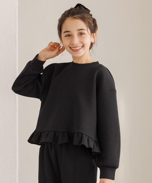 裾フリルで可愛く仕上がる。動きやすいソフトスウェットのキッズトップス