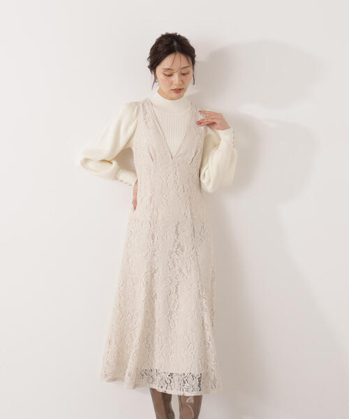 シャープに開いたVネックデザインのレースジャンスカ。