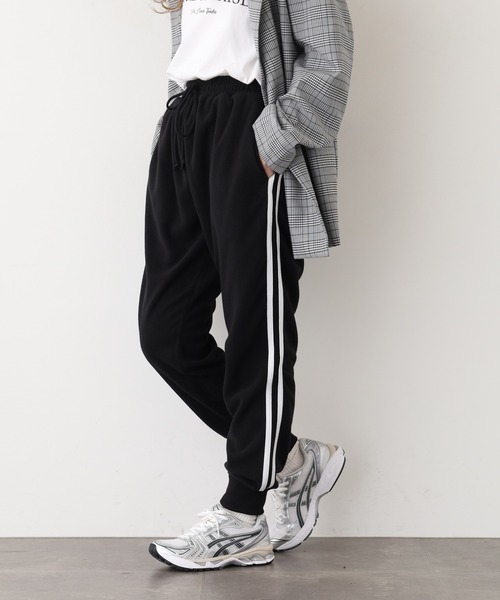 柔らかな肌触りと保温性を兼ね備えた裾リブ仕様のライン入りフリースジョガーパンツ