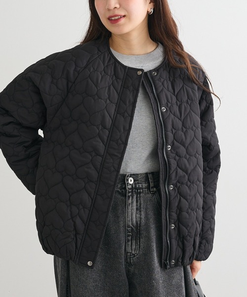 キュートなハート柄キルティングが目を惹くノーカラーブルゾン。