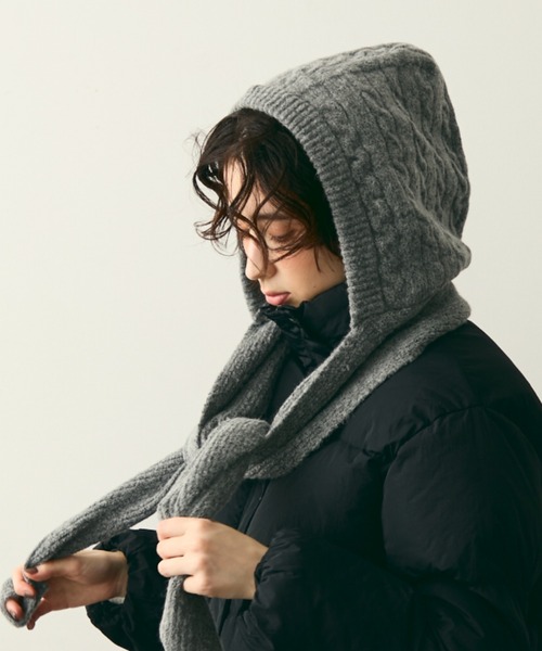 立体感のあるケーブル編みが魅力の、フード付きマフラーです。