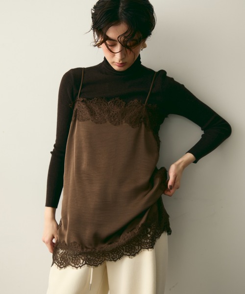 繊細なケミカルレースと艶やかなサテン素材を組み合わせた、上品でフェミニンなキャミソールです。