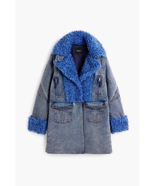グレーのデニム素材に、Desigual らしい鮮やかなブルーのリサイクルファーを組み合わせた長袖コート!