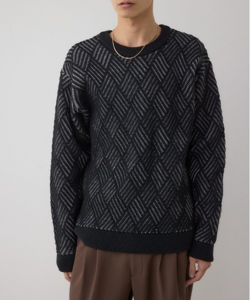 細番手の糸を掛け合わせることで、凹凸のある編地に微配色が生まれ、幾何学模様が上品に映えます。