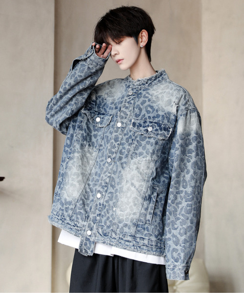 参考商品名:【neos】ルーズシルエット レオパード 総柄 アニマル ノーカラー デニム ジャケット