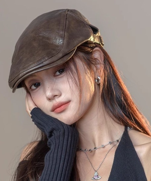 ほんのりツヤを感じるレザー調素材が上品なキャスケット。