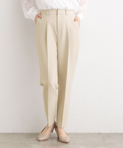 すっきりしたセンタープレス入りでお仕事からセレモニーに活躍のタック入りベーシックテーパードパンツ。