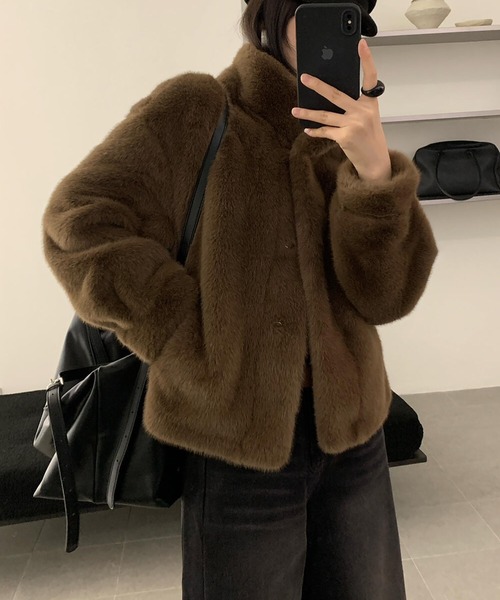 【ショート丈×スタンドカラーで上品に映える】ふんわりとしたエコファーの質感が、顔まわりまでやさしく包み込むショート丈コート。スタンドカラーが上品な印象を与えつつ、しっかりと防寒してくれるのも嬉しいポイントです。軽やかな着心地でデイリーに活躍し、きれいめにもカジュアルにも合わせやすい万能アウターです。