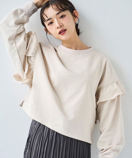 ドロップショルダーの切り替え部分に立体フリルを施し、シンプルなスウェットを大人可愛い表情に。