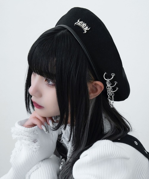 チェーンディティールが可愛いロゴ入りのベレー帽。