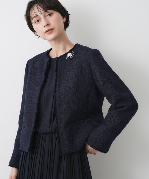 上品なラメが織り込まれたツイード素材を使用したノーカラーツイードジャケット。