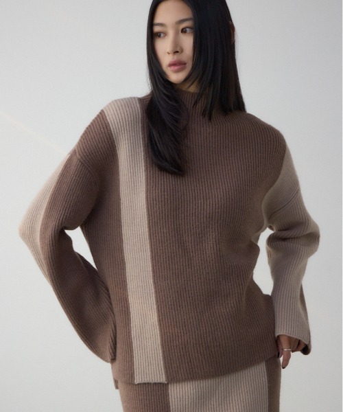 配色切り替えがモードな印象を与える、存在感抜群のハイネックニットプルオーバー。