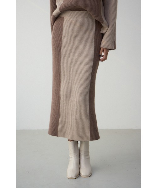 縦ラインを強調する配色デザインがスタイルアップを叶える、モードな印象のニットタイトスカート。