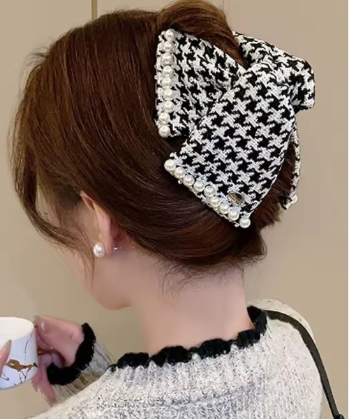 上品なツイード素材と千鳥柄にパールをあしらった、クラシックムード漂うリボンバンスクリップ。