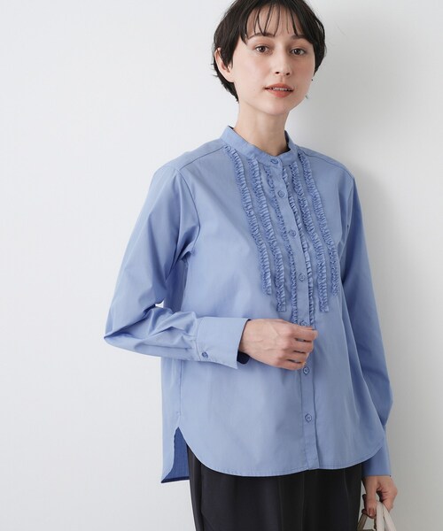 胸元のフリルが視線を上に引き上げ、小顔効果&スタイルアップを叶えます。