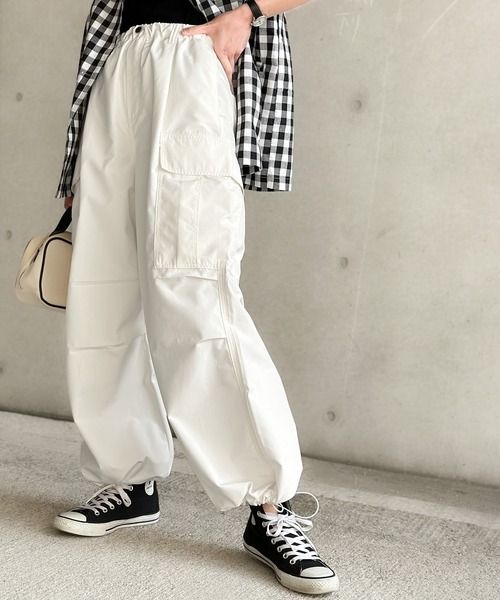 キーワード:カーゴパンツ レディース ウエストゴム ストレート ハイウエスト フルレングス ワイドパンツ 無地