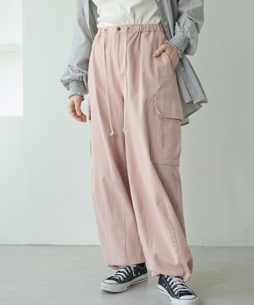 キーワード:カーゴパンツ レディース ウエストゴム ストレート フルレングス レギュラー ワイドパンツ 無地