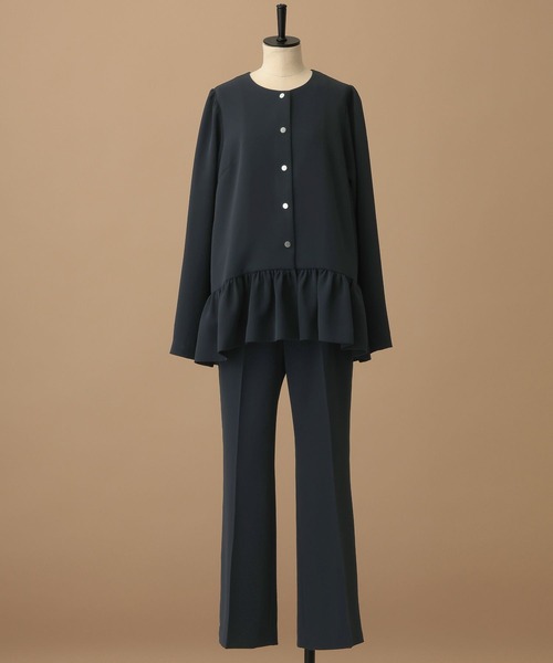 一見クールな印象のジャケットに、裾のさりげないペプラムがふわっと動きを添えるセットアップ。