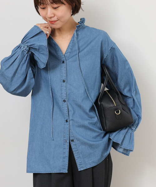 ◆カジュアルな薄手デニムにフリルをプラスしたブラウス。