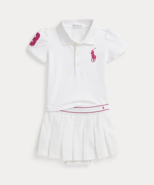蒸れにくいストレッチメッシュ素材を使用し、アイコニックなシグネチャーのポニーをアレンジした刺繍を施したポロシャツとプリーツスコートのスポーティなセット。