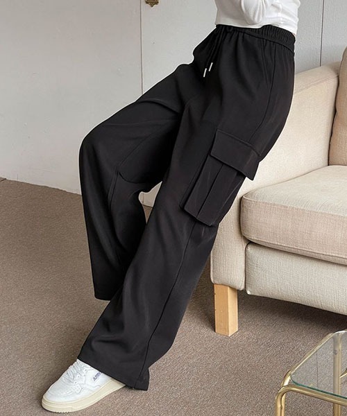 キーワード:カーゴパンツ レディース ウエストゴム ストレート ハイウエスト フルレングス ワイドパンツ 無地
