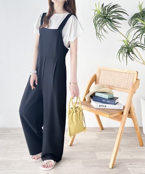 参考商品名:シンプルながらもこなれ感。バックシャーリングリネンライクサロペット