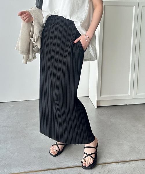 腰回りをすっきり見せるタイトシルエット、ボディラインをカバーする縦ライン強調の太めプリーツなどが、スタイルアップ見えするポイント!
