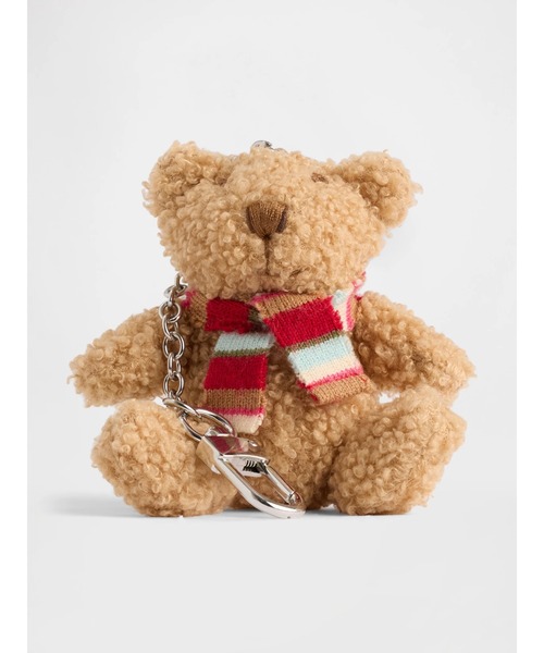 くまの顔パーツ刺しゅうディテール、ストライプ柄マフラー