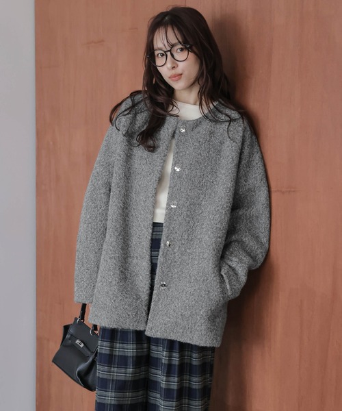 ゆったり柔らかなブークレーコート程よく丸みのあるコクーンシルエットがトレンド感のあるコート。