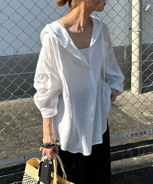 参考商品名:【総合ランキング1位獲得】フード付きシアーシャツ(chiica select) / フード付きシャツ ワッシャー シアーシャツ シアートップス シースルー ルーズシャツ カラーシャツ カーディガン 羽織り 秋