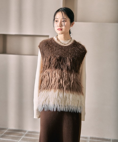 シャギー部分がグラデーション見えするのがポイントのニットベストです。トップスにプラスするだけでスタイリングの主役になります◎