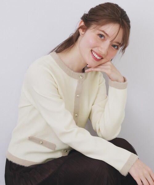 ・衿元や前立て、袖口にあしらわれたフェザーヤーンの配色トリミングが、さりげない愛らしさとエレガンスを演出。
