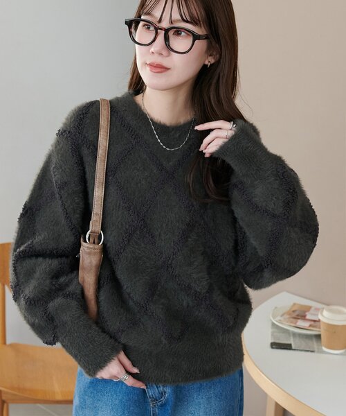 表面に立体感のあるダイヤ柄がコーデの主役に!・ふわっと柔らかなフェザーヤーン素材で、軽くて肌触りがやさしい