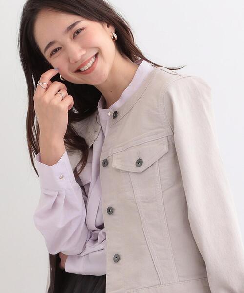 きれいめにも着回しできる、大人が着やすいノーカラーデニムジャケット。