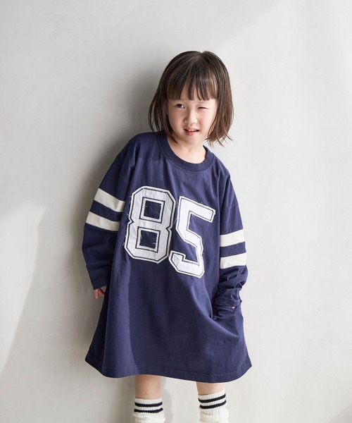 ローリーズファームキッズ定番のカットソーワンピースの形に、加工感のあるナンバリングと同じ素材のラインデザインで、古着感のある1枚に仕上げました!