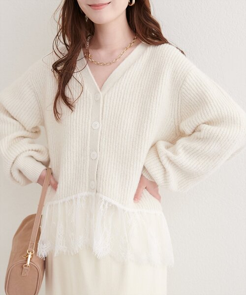 裾にあしらわれたレースが特徴的なカーディガン。