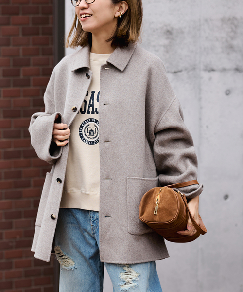 カバーオールとステンカラーコートの間のような、さっと羽織りやすいミドル丈のコート。