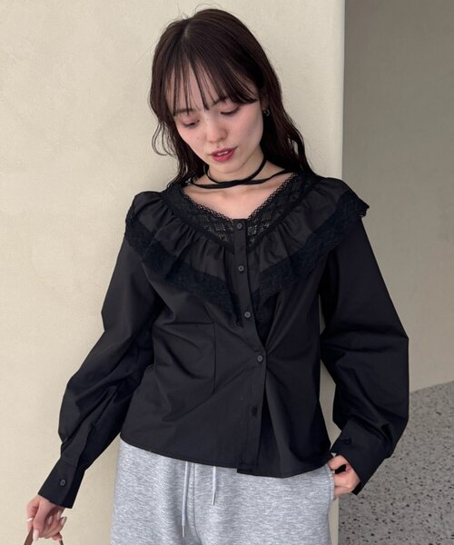 →レースとフリルのデザイン+チョーカー付きで1枚で簡単に映えるブラウスです?