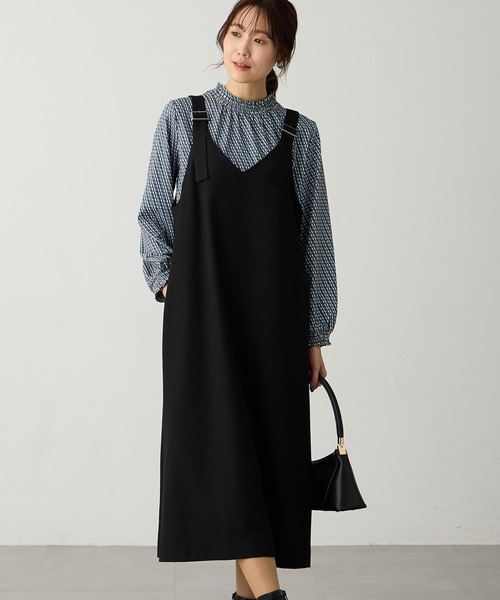 ショルダーのバックルデザインがポイントのジャンパースカート。