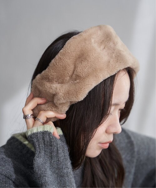 耳元を優しく包み込むフェイクファーのカチューシャ型イヤマフ。