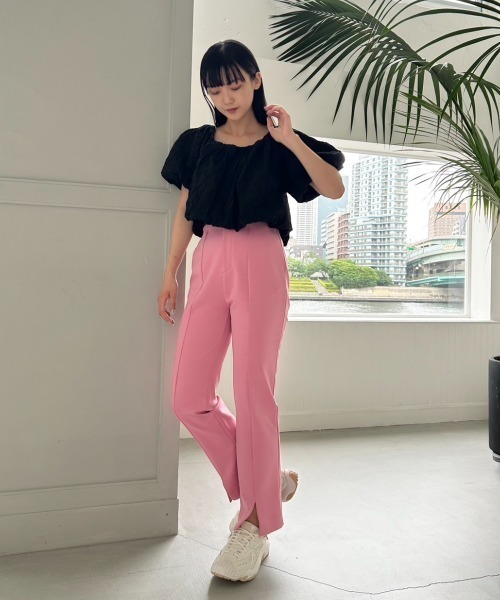 キーワード:パンツ レディース ウエストゴム ストレート ハイウエスト フルレングス リブ 無地