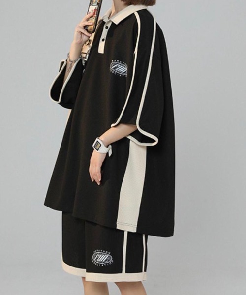 参考商品名:【ユニセックス】ビッグシルエット ポロシャツ 袖ラインジャージセットアップ / 上下セット