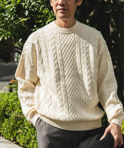 クラシックなアラン編みが目を惹く、クルーネックプルニット。