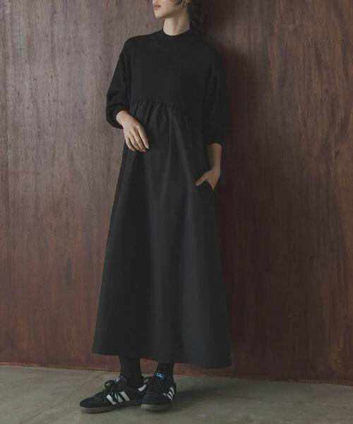 ゆったりとした着心地ながら、きちんと感も出るドッキングワンピース伸縮性があり着膨れしない程よい肉感のニット素材と、ハリ感とおち感のバランスの良い素材を切り替えたドッキングデザインのワンピース。