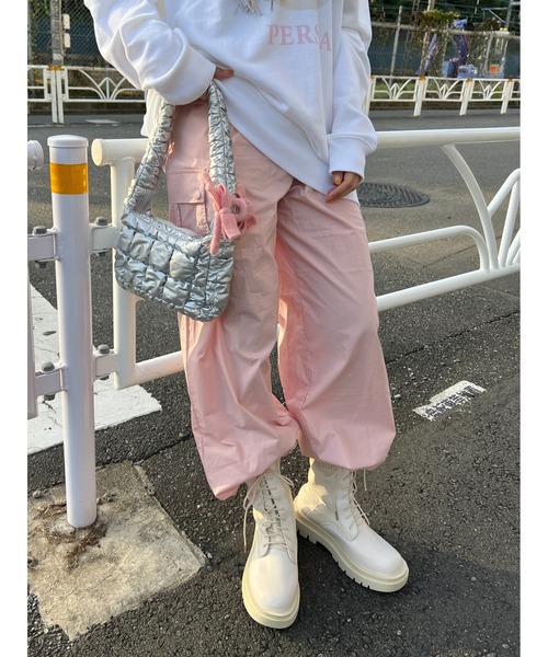 キーワード:カーゴパンツ レディース ウエストゴム ハイウエスト フルレングス ワイドパンツ 無地