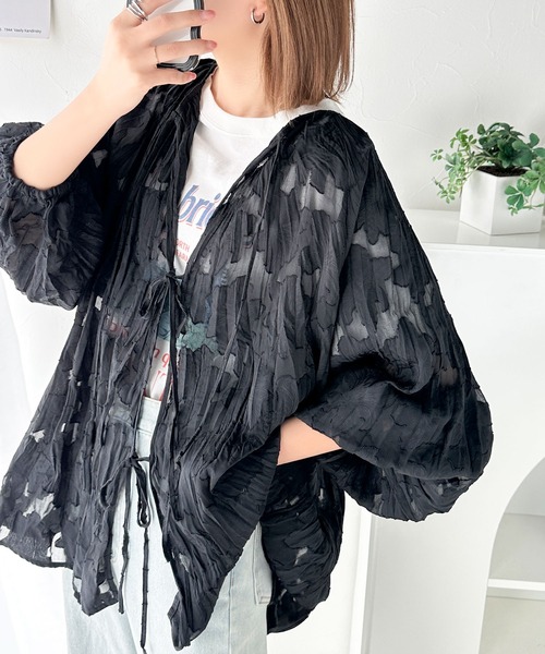 参考商品名:ほどよい透け感の上品トップス。前後2wayボリュームスリーブリボンシアーカーデブラウス
