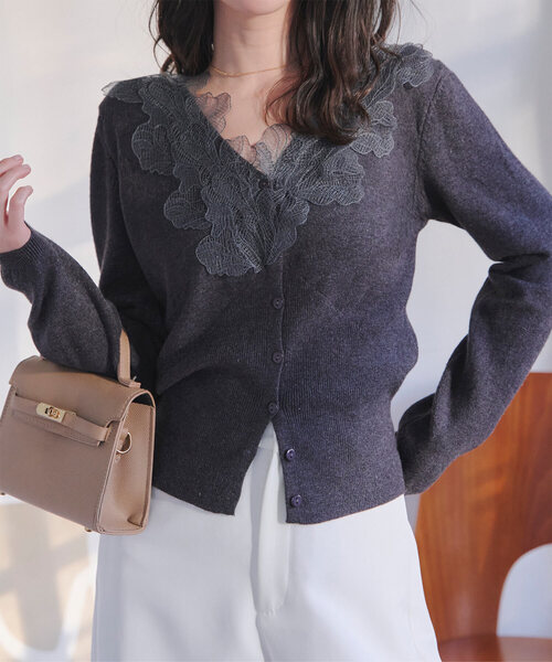 襟元にあしらったレースが華やかさと上品さを添える、レディースニットカーディガン。