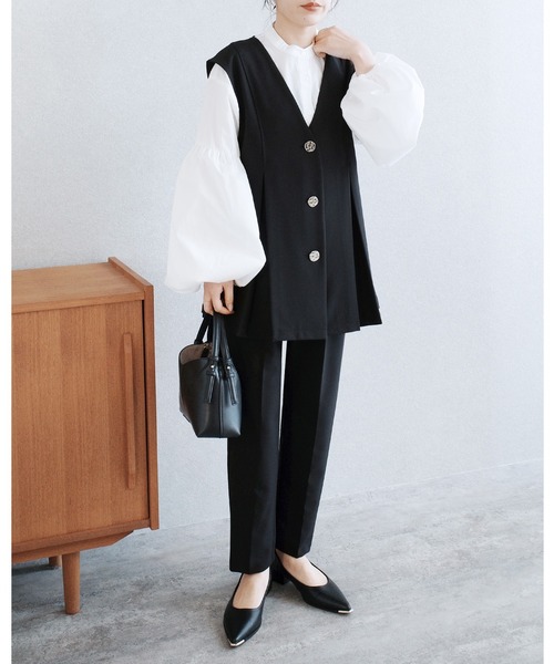 \こなれ感のあるゴールドボタンのベストときれいめパンツのセット/
